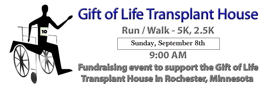 The Gift Of Life Transplant House (http://www.gift-of-life.org/), located in Rochester, MN, offers a very affordable and high-quality housing solution for patients undergoing a solid organ or bone marrow transplant. All proceeds from this fundraiser go to the Gift of Life Transplant House. The race will be held at the Gift of Life Transplant House 705 2nd SW Rochester MN. Both the 5K run and 2.5 K walk are an out and back route following the same path.